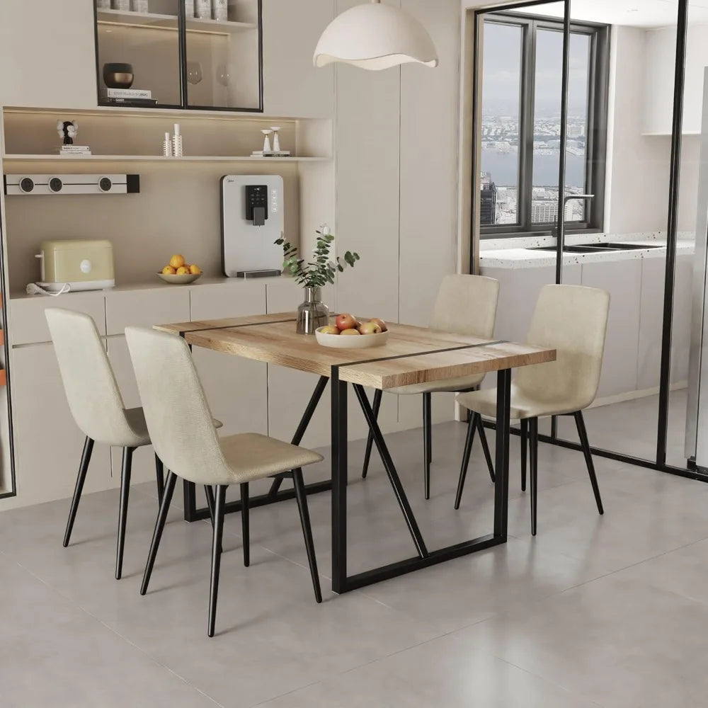 5-Piece Dining Table Set | Beige Wooden Kitchen Table with 4 Upholstered Chairs and Fabric Cushions Space-Saving and Moder