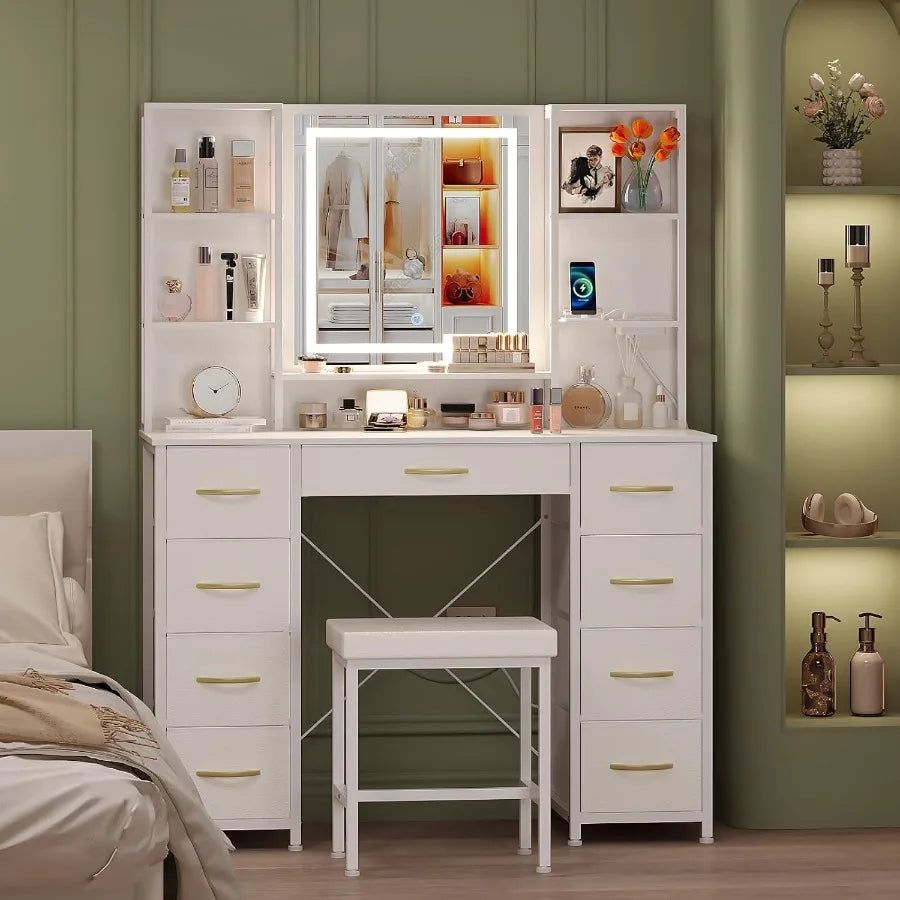 Vanity Desk with Mirror and Lights Charging Station Modern Industrial Dressing Table with 9 Fabric Drawers and Open Storage She