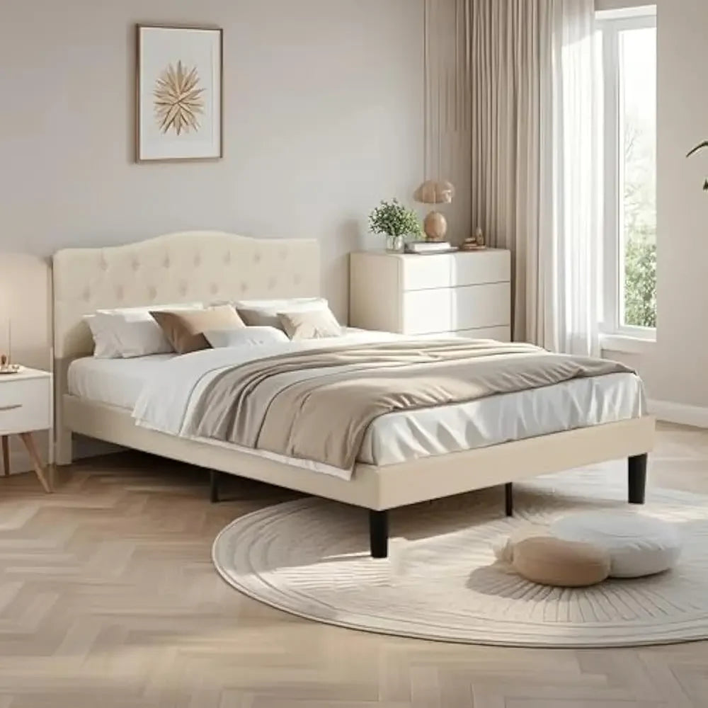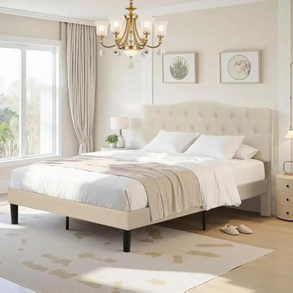 Full Size Bed Frame with Fabric Upholstered Headboard and Wooden Slats Support, No Box Spring Needed/Easy Assembly