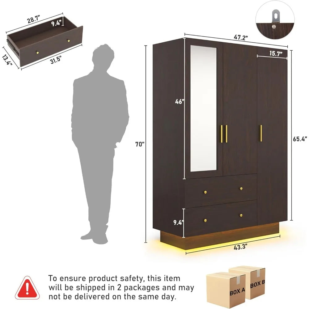 Doors Armoire Wardrobe Closet with Mirror, LED Armoire with Doors and Drawers, Wooden Wardrobe Storage Cabinet with Hanging Ro