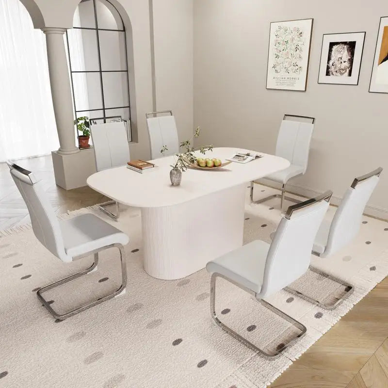 Medieval Modern Cream Style MDF Dining Table with PU Armless Chairs Set of 6 - Assemble Desktop with Silver Plated Metal Legs,