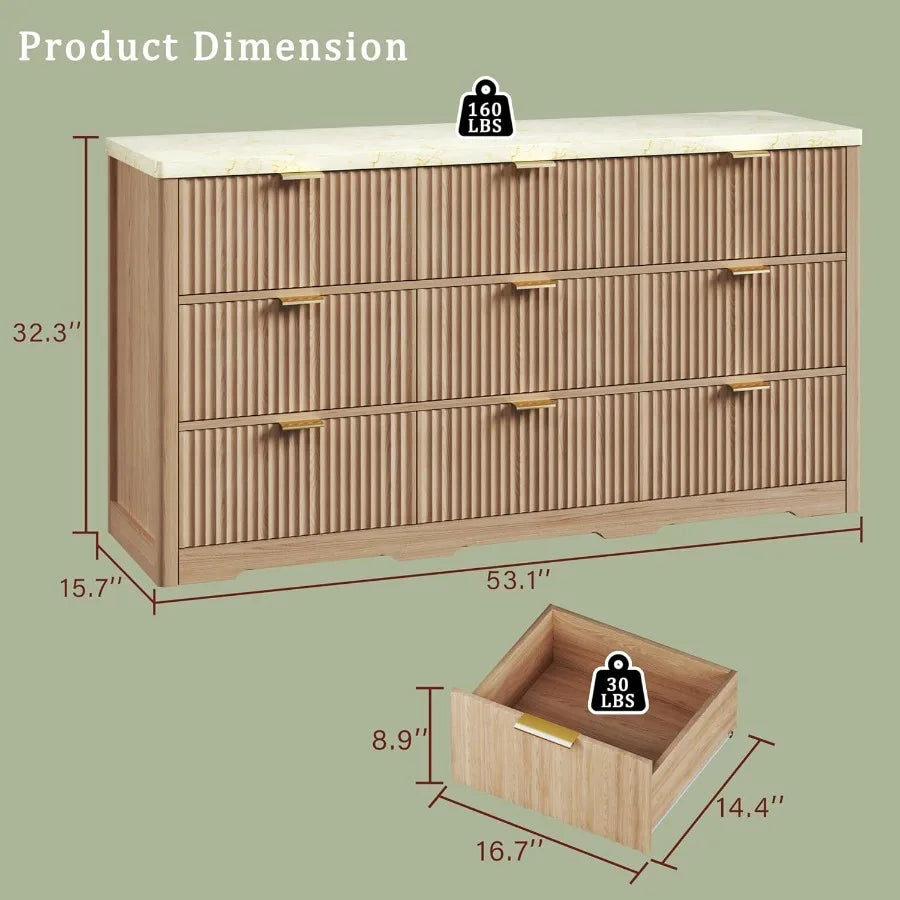 Fluted Dresser with 9 Drawers 53'' Mid Century Modern Dressers with Faux Marble Top Wood Chests of Drawers with Gold Handle Cur
