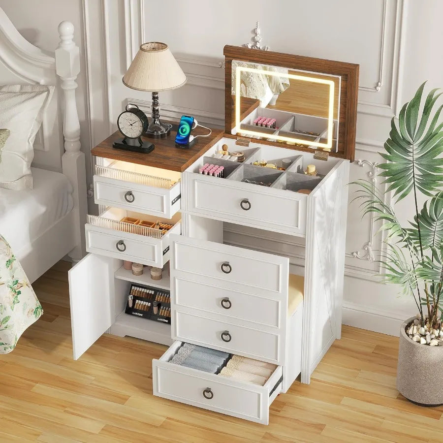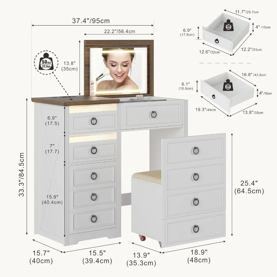 Farmhouse 3in1 Vanity Desk Makeup Table with Flipup 3 Colors Lighting Mirror and Hidden Stool Charging station Body Sensor Vani