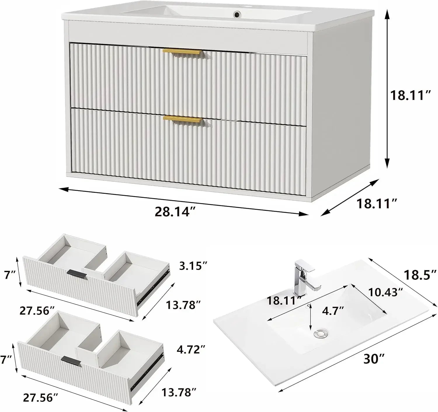 30'' Floating Bathroom Vanities with Sink, Wall Mounted Bathroom Floating Vanity with Ceramic Sink,2 Drawers, Soft-Close Doors