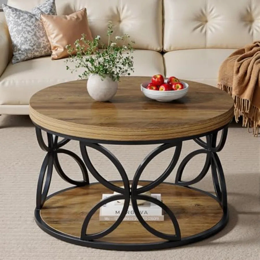 Round Coffee Table with Storage 2Tier Circle Center Table for Living Room Rustic Brown Table with Wood Grain Black Metal Frame