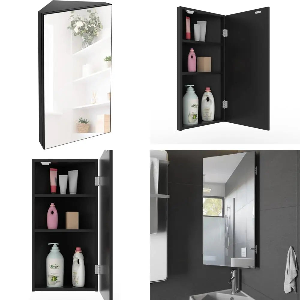 24 Inch Corner Medicine Cabinet with Mirror and Triple Hanging Shelves - Black Wall Mount Bathroom Storage