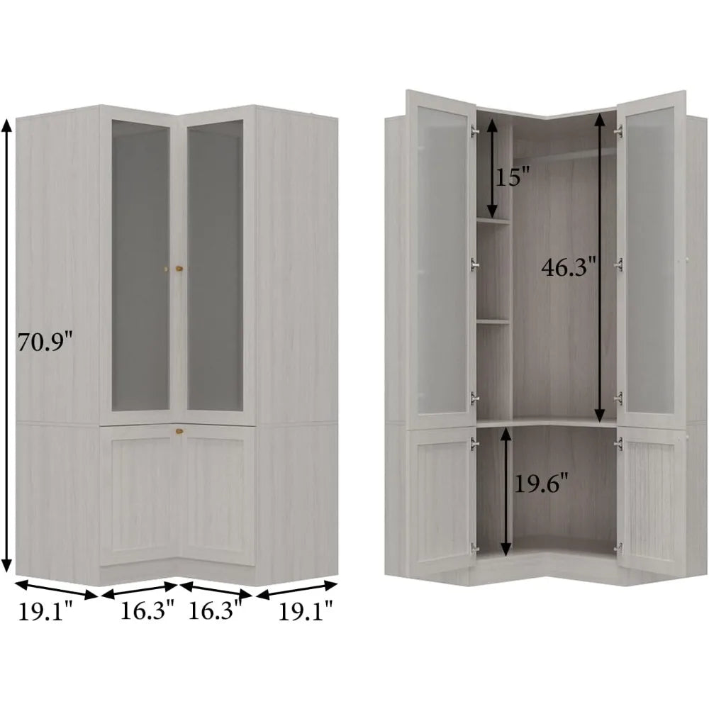 Corner Wardrobe Closet with 2 Glass Doors, Armoire Wardrobe Closet with Hanging Rod, for Bedroom Wood Grain (16.3+19.1”W