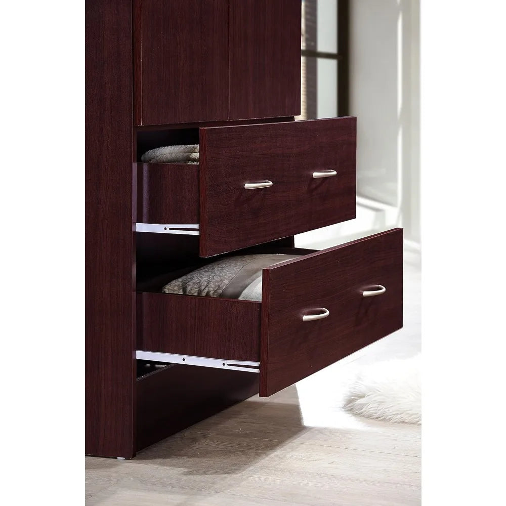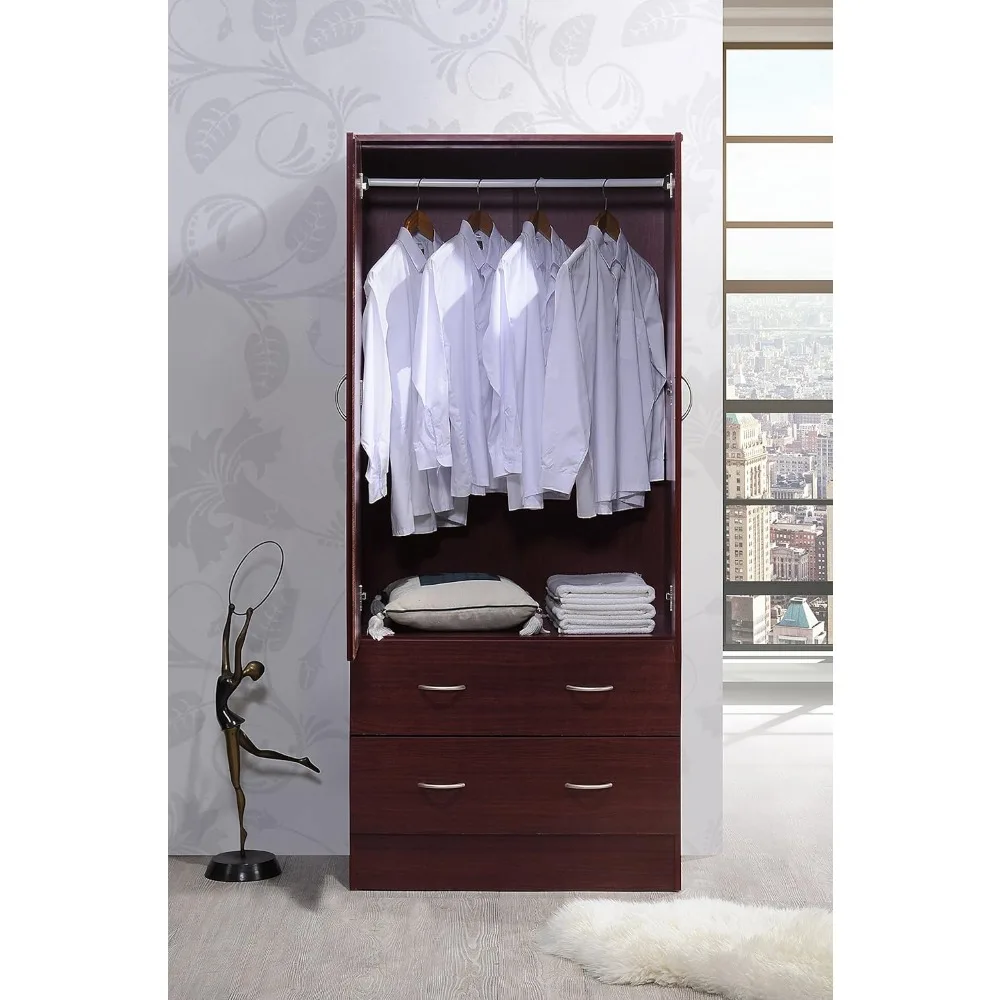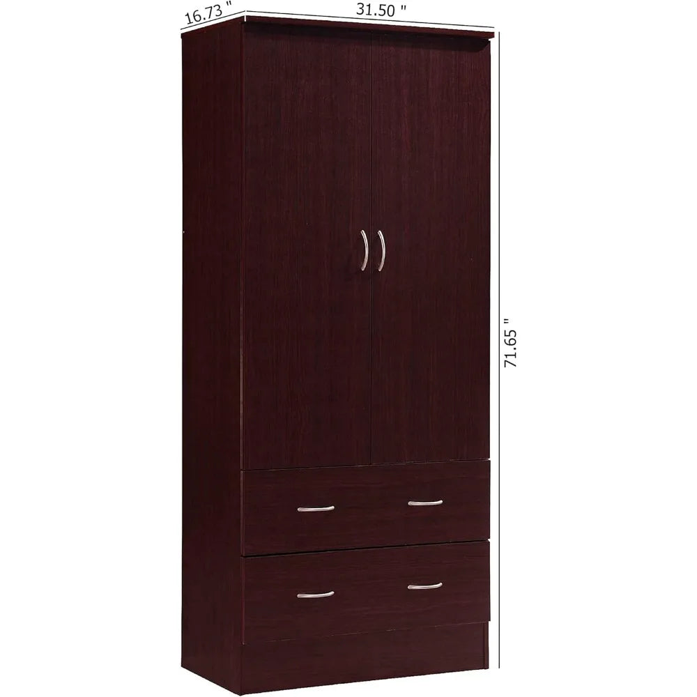This item features an engineered wood construction and is imported. It has an assembled size of 72 inches in height, 31.5 inches in width, and 17 inches in depth. The 32-inch width makes it a perfect fit for small rooms that require maximum space utilization. Inside, there's a clothing bar that spans the entire width of the armoire, providing ample space for hanging clothes. Additionally, it includes two drawers that offer support and are ideal for organizing stackable clothing. These drawers are mounted on metal rollers, ensuring a smooth operation when opening and closing.