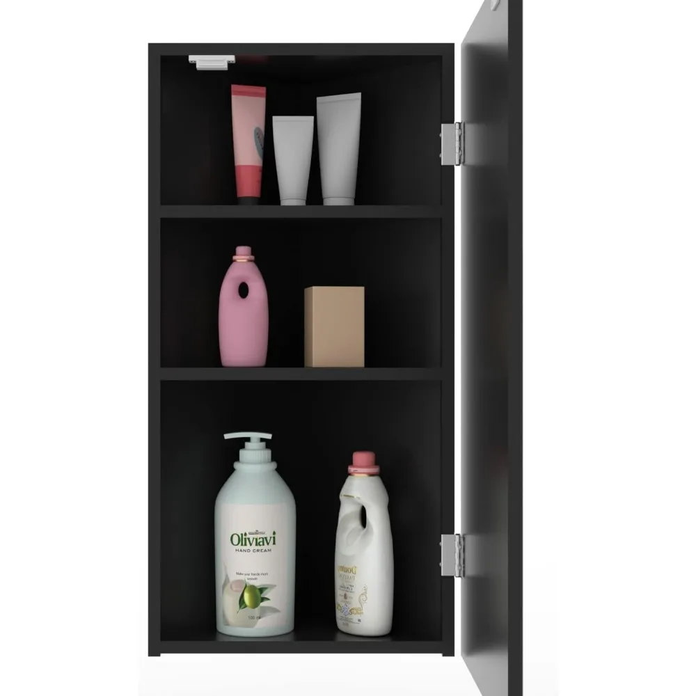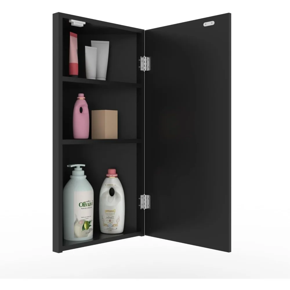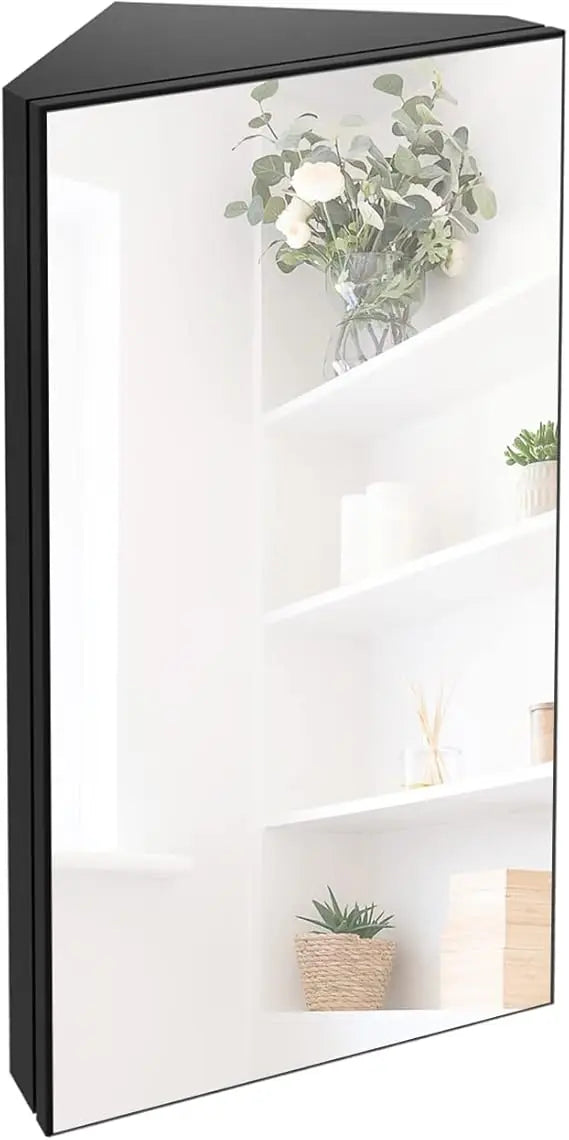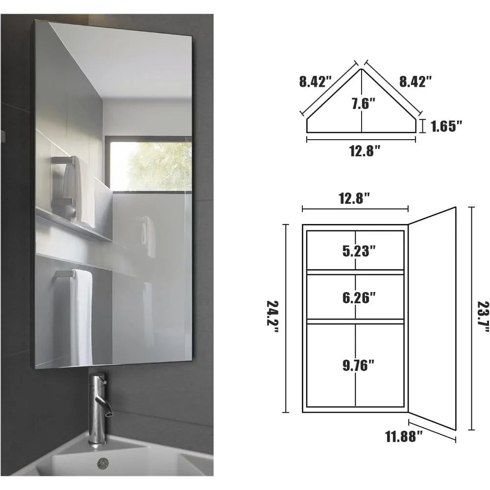 This medicine cabinet is crafted from 15 mm PB board and features a high-definition glass mirror, providing a clear and undistorted reflection that enhances the brightness of your bathroom. The quiet hinges and suction doors ensure a noise-free experience. Ideal for small bathrooms, it can be mounted in the corner to conserve space and give the illusion of a larger area, with three practical shelves offering ample storage. The cabinet has overall dimensions of 24.2 inches in length, 12.8 inches in width, and 7.6 inches in depth, with a mirror size of 23.7 inches by 11.88 inches and triangle side lengths of 8.42 inches. The internal storage heights are 5.23 inches, 6.26 inches, and 9.76 inches. The triangular design not only offers stability but also space efficiency, suitable for installation in bathrooms, kitchens, or living rooms, with a static load capacity exceeding 60 lbs. The cabinet is equipped with a waterproof coating, making it easy to clean, and comes with detailed instructions for DIY installation, typically taking less than 20 minutes to set up.