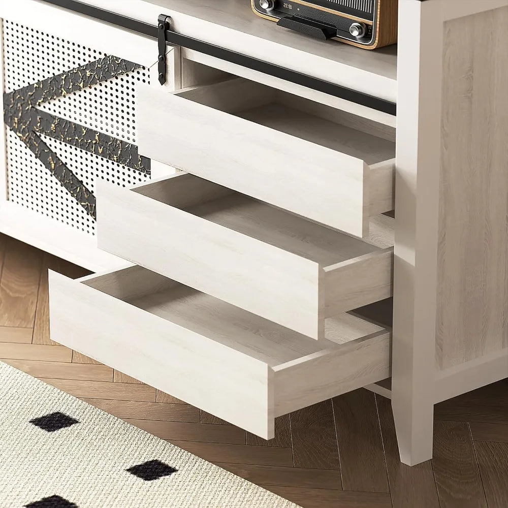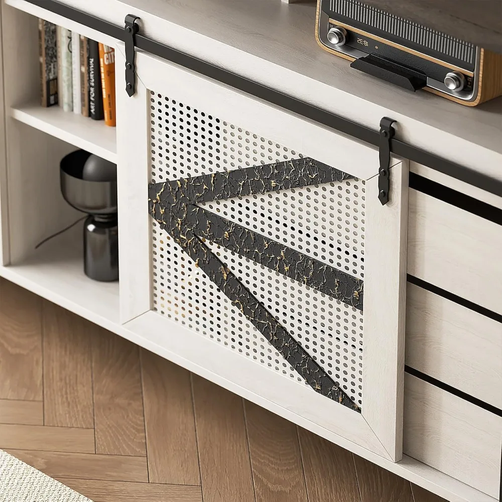 • 【Ample Storage & Display Space with Barn Doors】Side cabinets behind sliding barn doors that have six drawers provide organized hidden storage, while two central open shelves offer space for media devices, books, or decorative items. This design keeps your living room tidy and stylish.