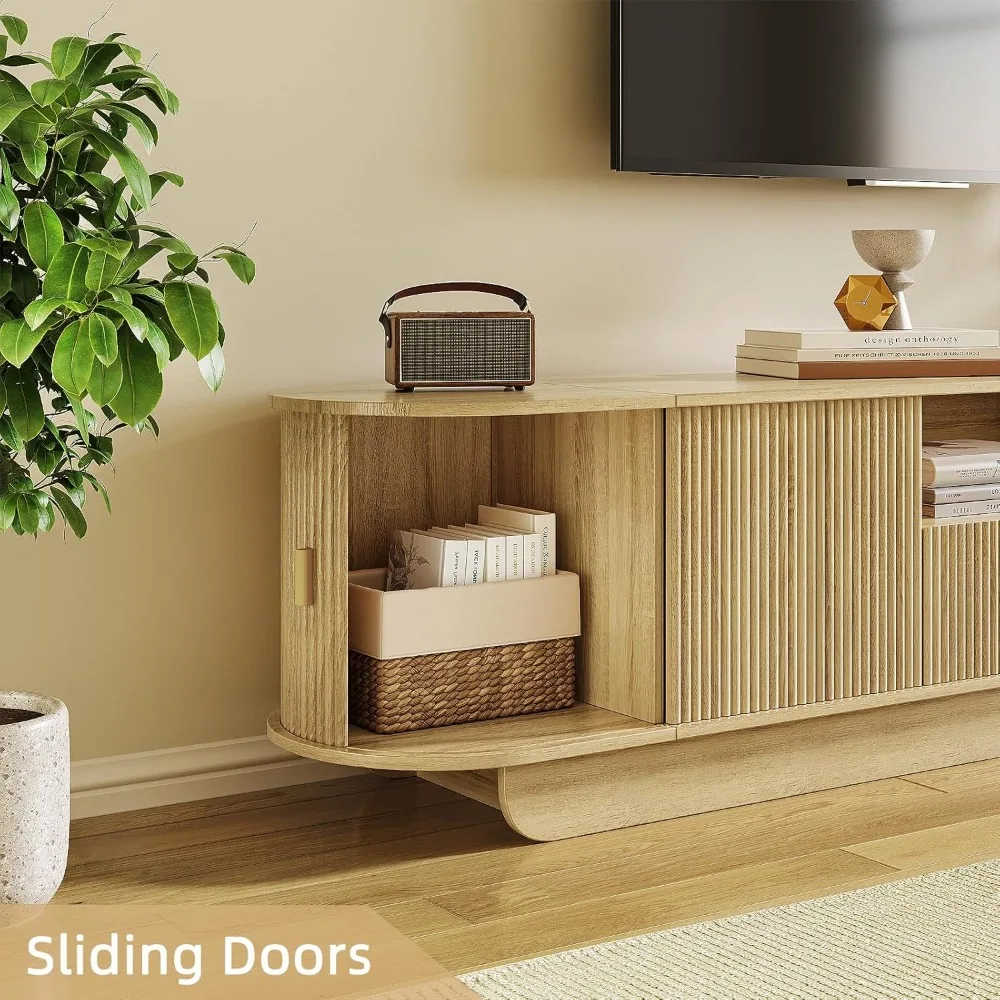- 【Sliding Door & Curved Edge】Features a modern sliding door with rounded corners, mid century entertainment center prevents pointed bumps and 2 sliding doorswith glide mechanism and elegantly rounded edges—combining effortless functionality with a chic, space-saving design that complements any decor.