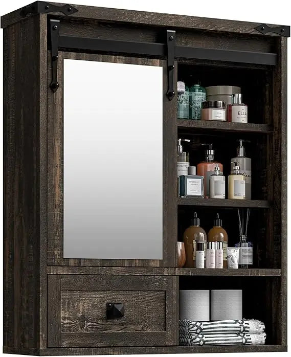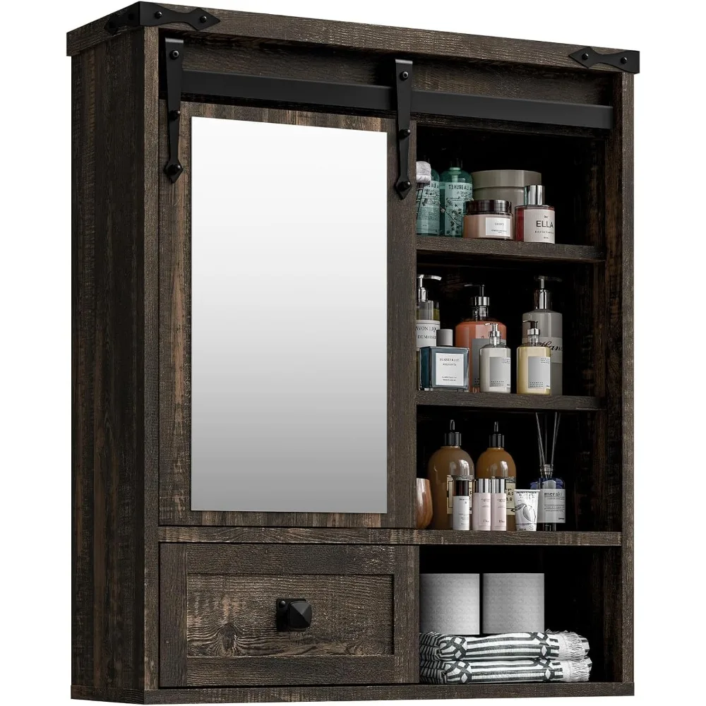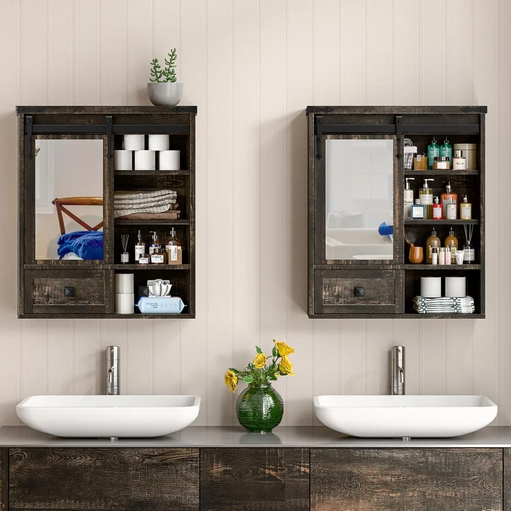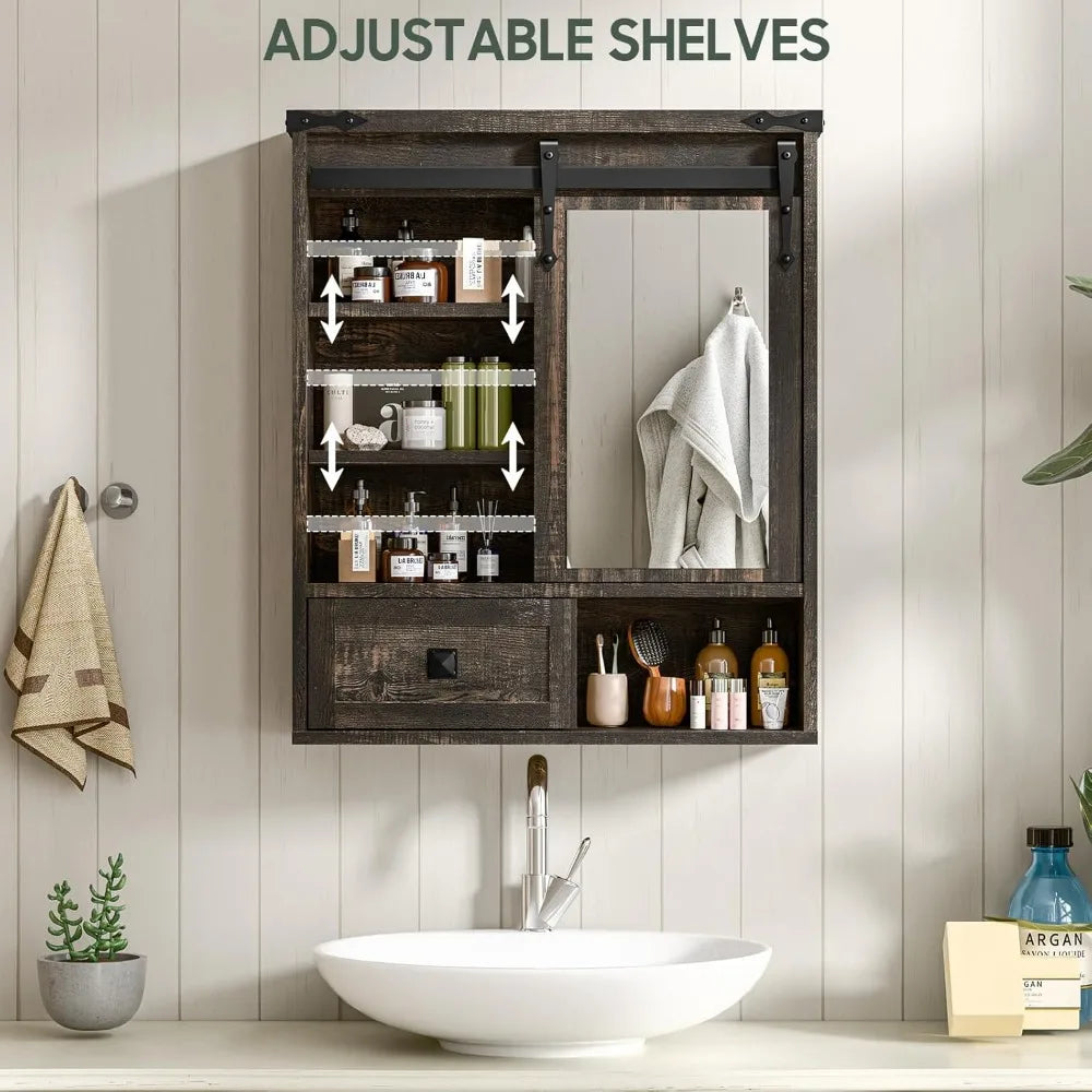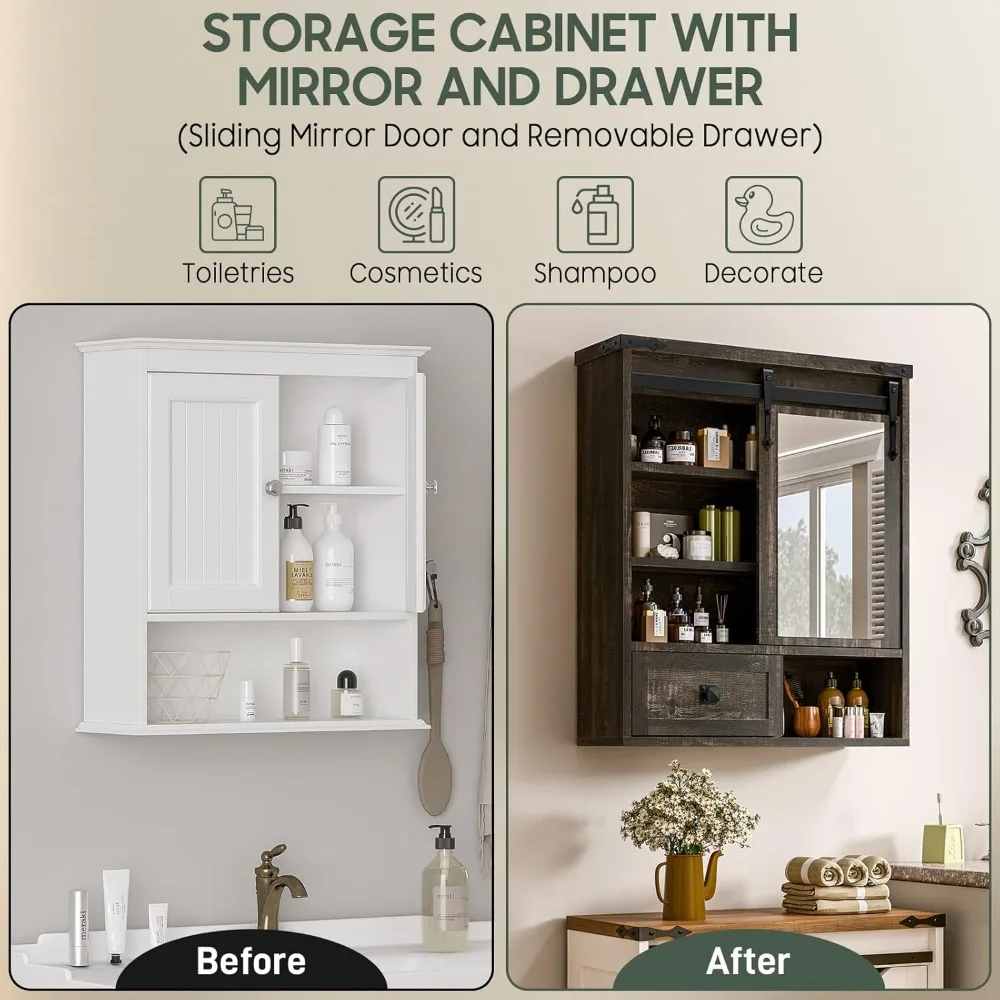 - FARMHOUSE MEDICINE CABINET WITH REMOVED DRAWER: Classic farmhouse aesthetic. The weather natural wood grain makes this cabinet a striking focal point in your home. We have also added an adjustable position or standalone drawer, which enhances both appearance and usability.