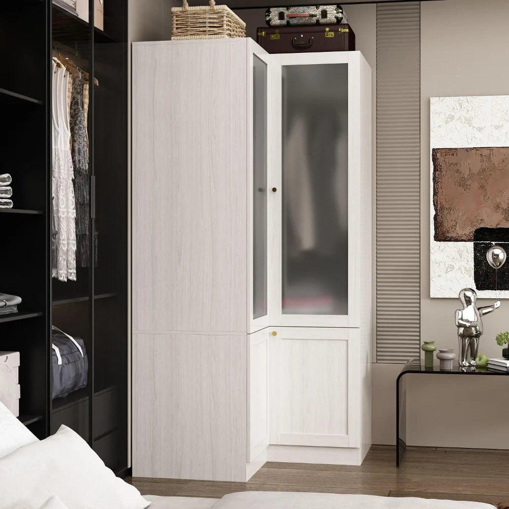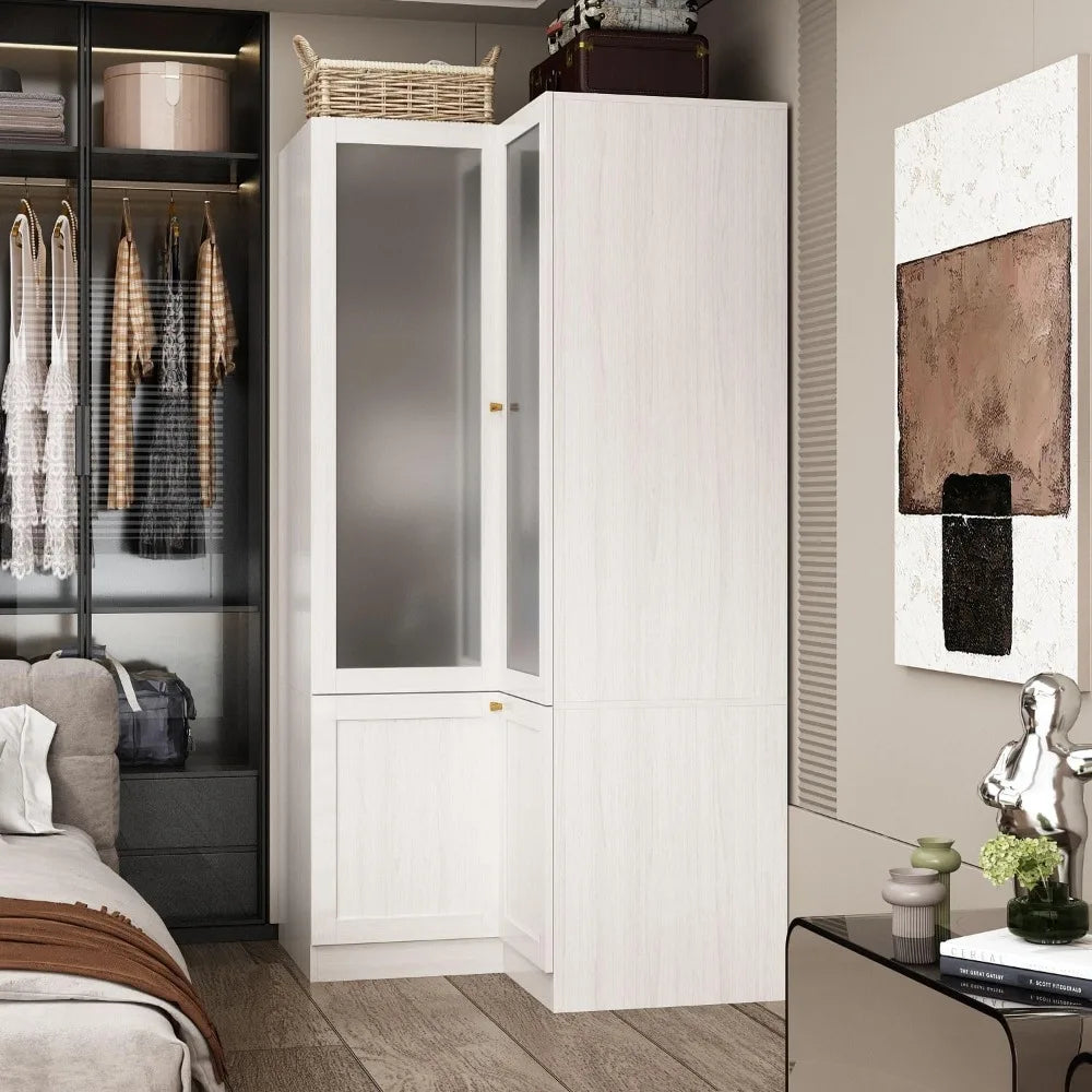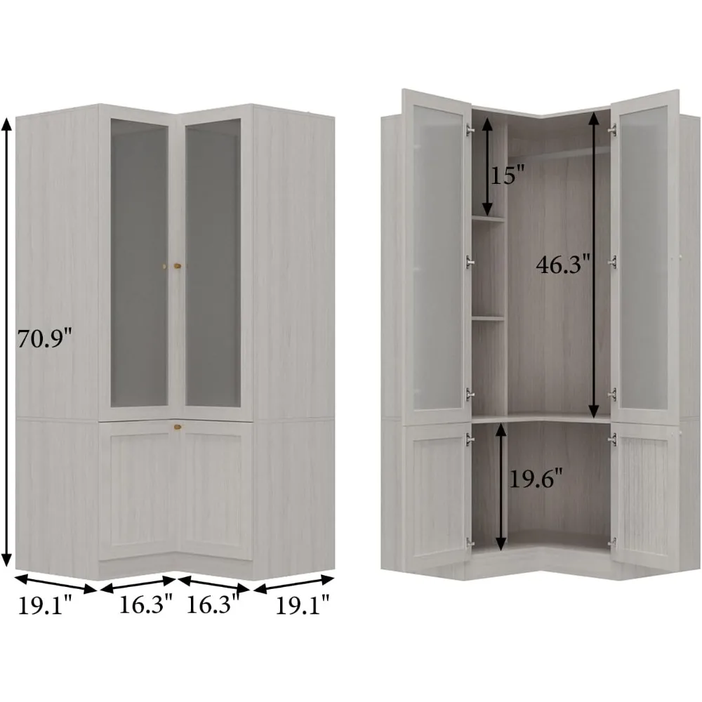 This wardrobe closet is a perfect blend of modern and fashionable design, featuring a shallow wood grain surface that brings a touch of nature to your bedroom. Its sleek, streamlined appearance and gold metal handles highlight the simplicity and elegance of this armoire, making it a versatile addition to any bedroom decor. The ample storage space includes a hanging area with a clothing rod for hanging uniforms, suits, dresses, and shirts, while the bottom drawers offer extra space for organizing socks, underwear, and pants. The glass doors not only add a stylish touch but also provide privacy for your belongings. Built to last, this wardrobe closet is constructed from high-quality particle boards, ensuring both stability and durability. The smooth veneer surface is resistant to wear and tear, waterproof, and easy to clean and dry. An anti-tip device is included to keep your family safe from any potential collapse. Assembly is required for this wardrobe, and it comes with numerous panels and screws. Each part is clearly labeled, and we recommend assembling it carefully by following the provided instructions step by step. The overall dimensions of the wardrobe are 35.4 inches wide, 35.4 inches deep, and 70.9 inches high. For more detailed size information, including the inner space, please refer to the size image in the product description. Before starting the assembly process, it's important to check the list of hardware, screws, and boards included in the instructions. Following the instructions carefully and assembling the item gently will help prevent any damage that might occur due to rough handling.