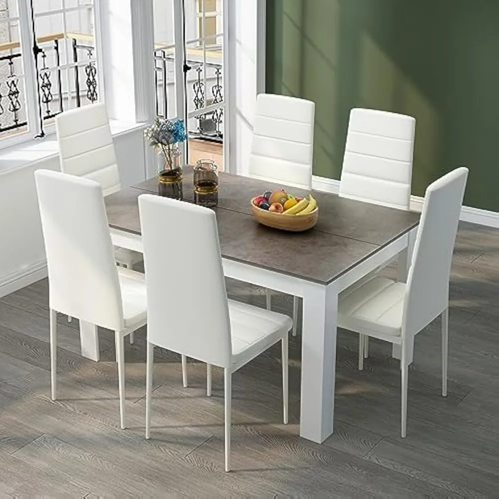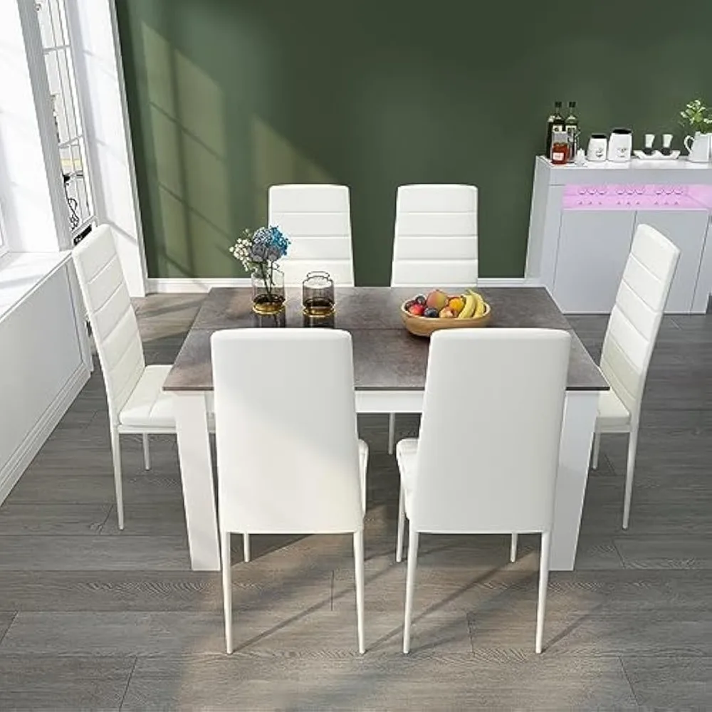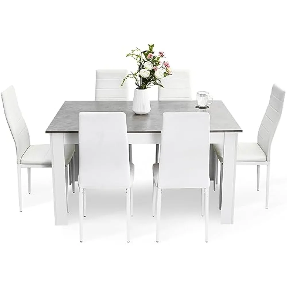 - [ Modern Style ] - The 7-piece kitchen dining set includes a grey dining table and 6 white chairs with a simple and modern appearance, allowing you to enjoy delightful dining or drinking time with family or friends in the kitchen or dining room.