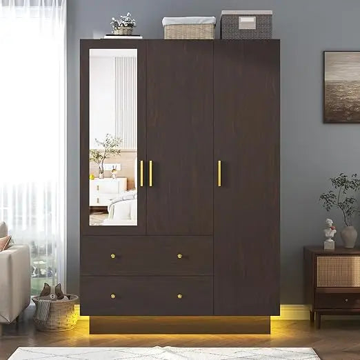 This product is a modern brown armoire wardrobe closet with three doors, designed to provide a functional and stylish storage solution for your bedroom. It features a hanging area, a stacking area, and a privacy area, all enhanced with LED light strips for added ambiance. The wardrobe also includes a clear half-length mirror measuring 46.4 inches deep by 11 inches wide, perfect for trying on clothes and checking your appearance. The mirror is accompanied by gold handles that complement the wardrobe's design. The wardrobe boasts a large capacity for storing your clothes, with two large drawers at the bottom for private storage and additional space at the top for items that are not frequently used. The wardrobe's details include buffer hinges that reduce door impact and allow for adjustable door gaps, ensuring a smooth and quiet operation. The drawers are equipped with 3-section slide rails for a smooth glide. Constructed from engineered wood, the wardrobe is both stable and reliable. We prioritize our customers and offer a confident purchase experience. The wardrobe is shipped in two separate packages, which may arrive at different times. Please be patient. The overall dimensions of the wardrobe are 19.7 inches in depth, 47.2 inches in width, and 70.1 inches in height.