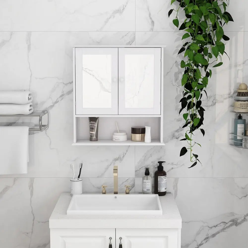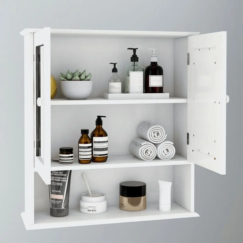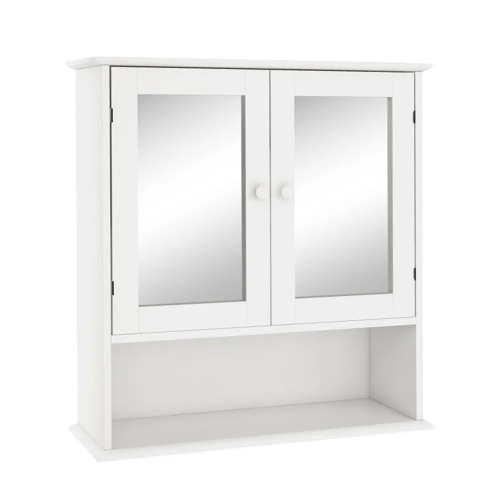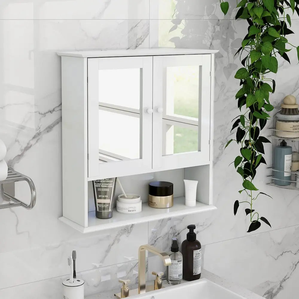 Multipurpose: The wall cabinet with mirror combined with modern style and simple storage space for bathroom.Features enclosed shelf with double shutter mirror doors, one open shelf to place towels, soap, tissues and other decorative items.