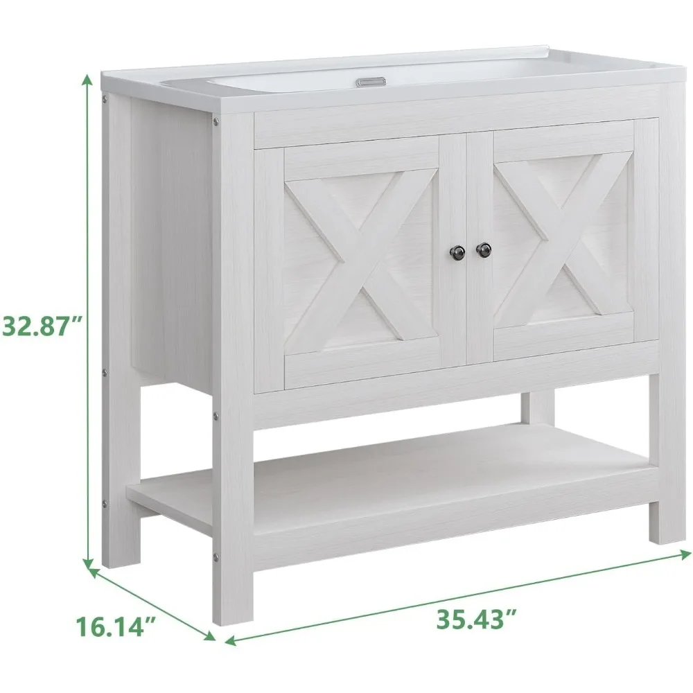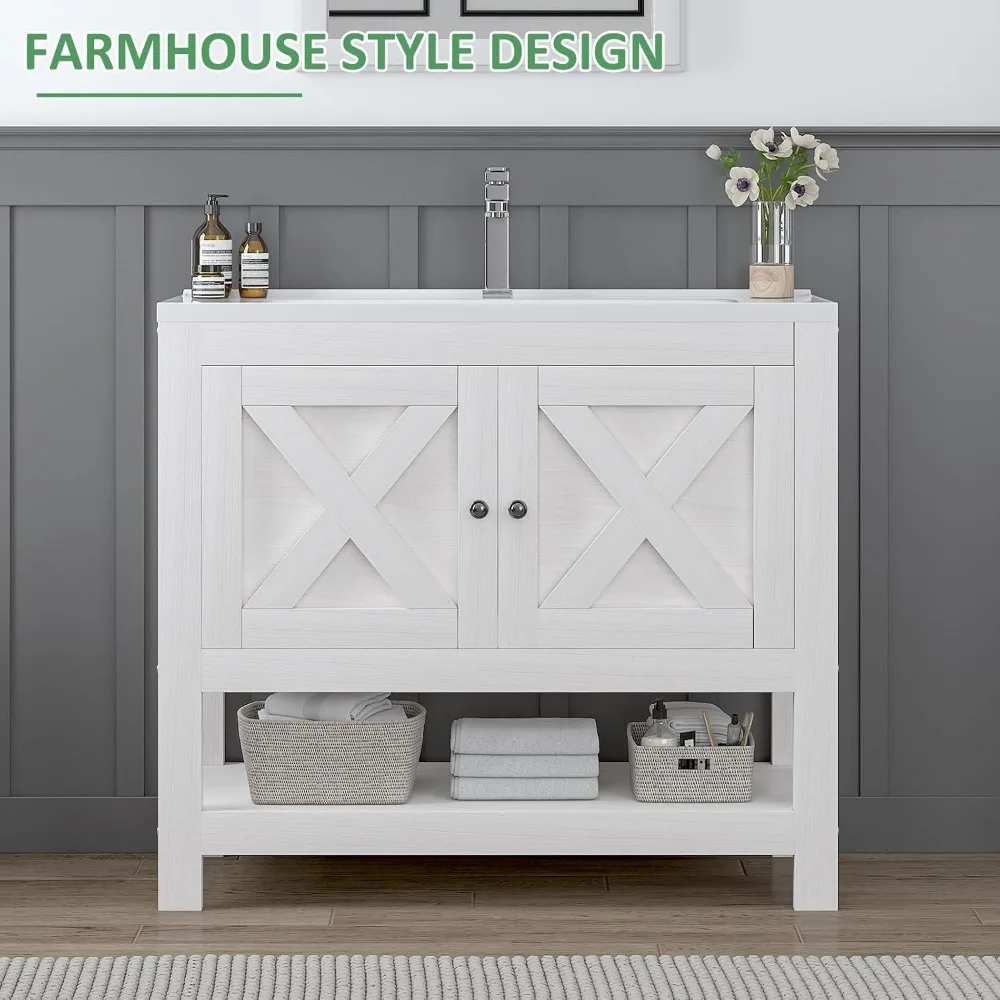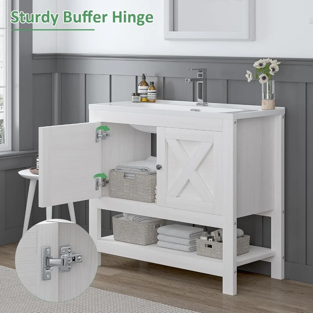 Ample Storage Space:This white bathroom vanity cabinet provides generous space with 2 doors and an open shelf, creating flexible organization options for bathroom essentials. Its well-planned layout keeps items neatly arranged while accommodating different-sized products