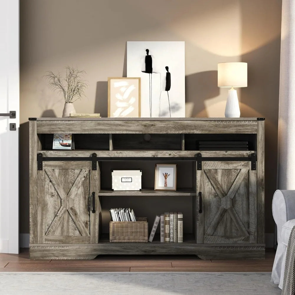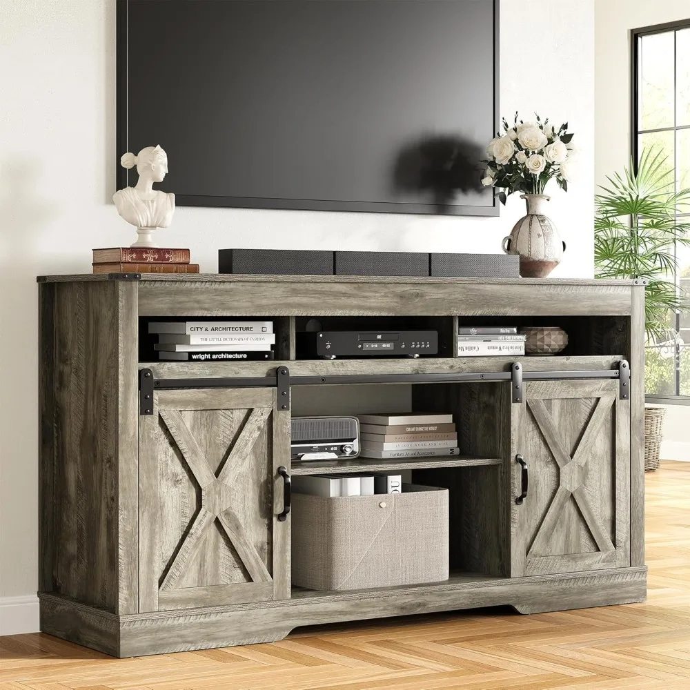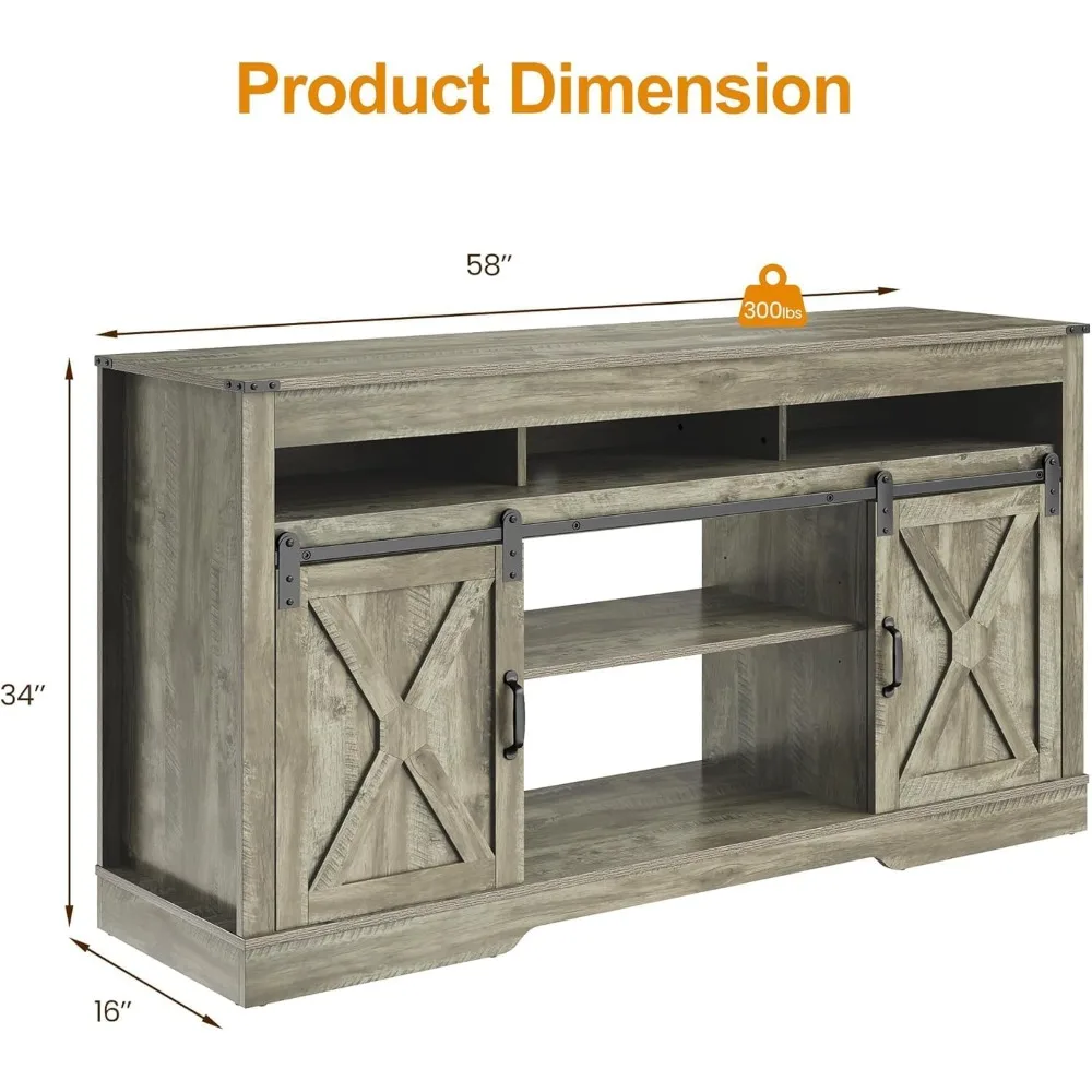 - Sturdy Construction: This farmhouse TV stand is not only safe and environmental-friendly but also the desktop has a good weight capacity of 300lbs. It is consists of high-graded-density engineered wood MDF and is certified CARB P2., and the slide and pulley are made of premium metal so it has a long service life. Moreover, the surface is waterproof and easy to keep clean.