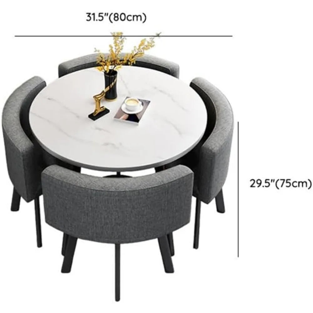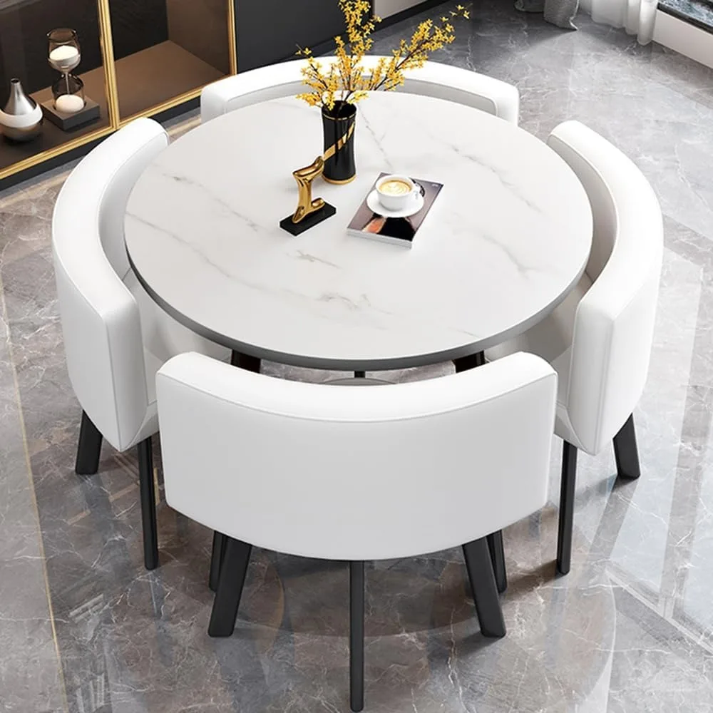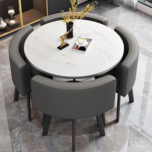 This dining table set, with its contemporary design, adds a touch of elegance to any home. The round coffee table and four chairs are versatile, suitable for a variety of settings such as kitchens, dining rooms, living rooms, balconies, lounges, dessert shops, offices, small hotel rooms, sales rooms, gardens, and more. The dining table measures 31.5 inches in length and width, with a height of 29.5 inches. The dining chairs have dimensions of 21.5 inches in length, 14 inches in width, and 27.5 inches in height. The chair backrests are designed with ergonomics and human body features in mind. They are covered in high-quality, wear-resistant PU leather, which is waterproof and easy to clean. The chairs are padded with soft sponge for comfort and relaxation. Our dining table and chairs are crafted from carefully selected, high-quality manufactured wood and metal, ensuring stability and durability. The legs of both the table and chairs are made of metal, providing uniform strength and load-bearing capacity. Assembly is straightforward, with all necessary accessories and a screwdriver included in the package. If you encounter any issues or have questions, our team is always available to assist you.