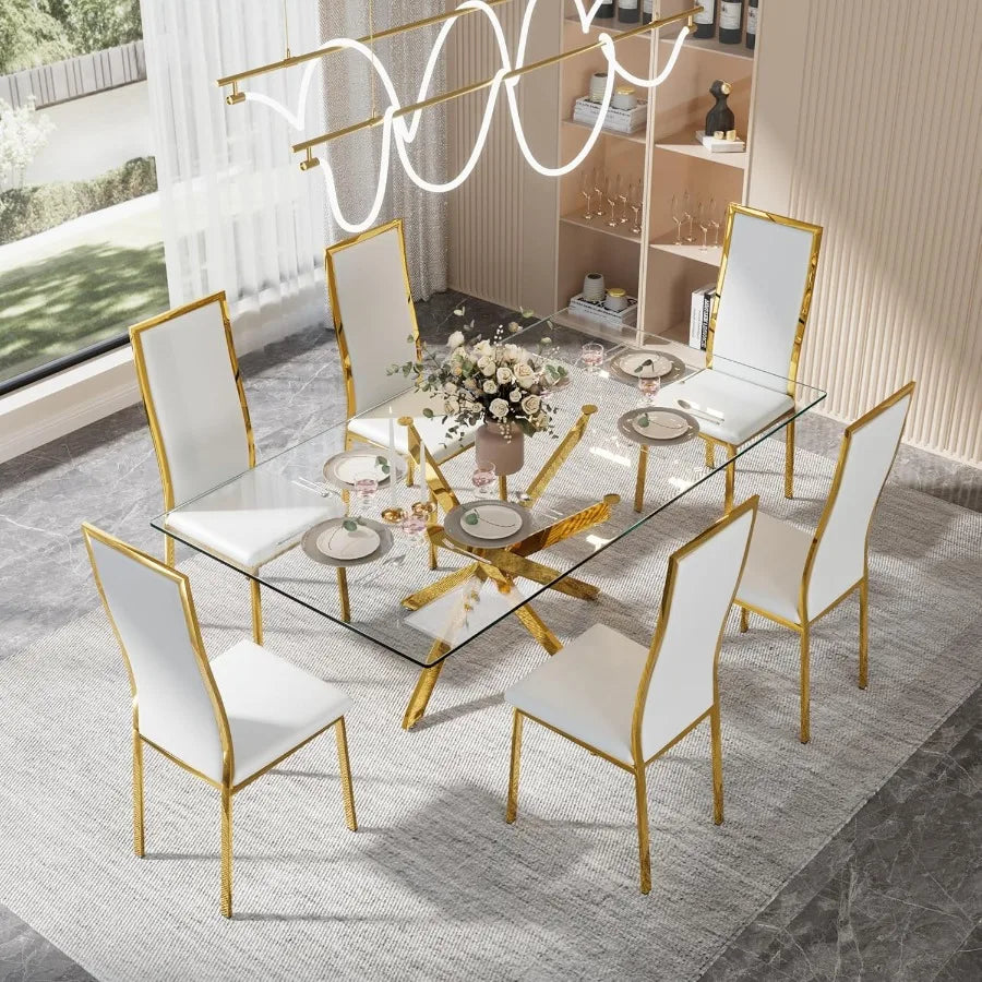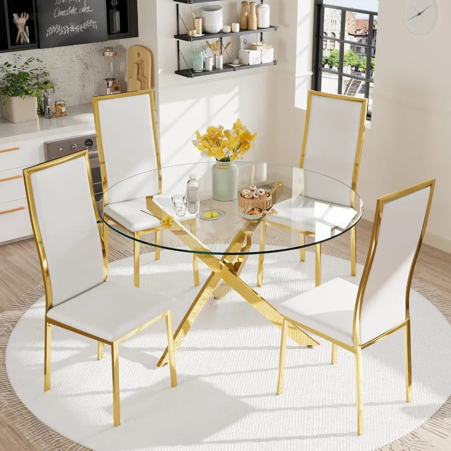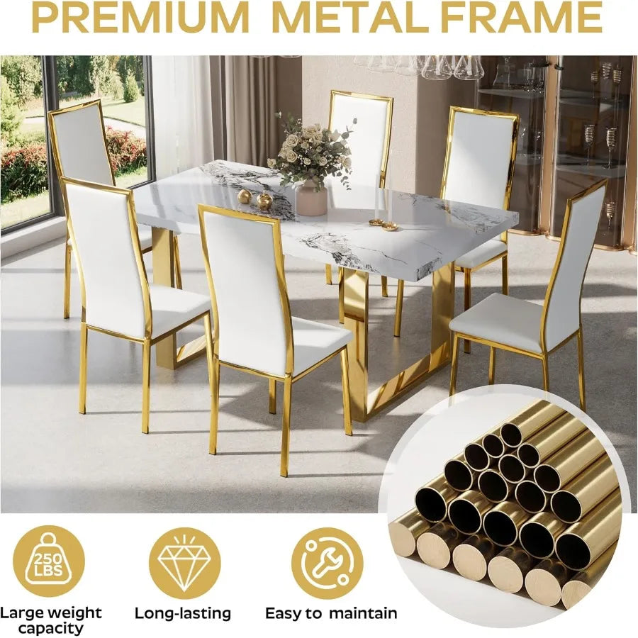 Modern Dining Chairs Set of 4 White Faux Leather with Chrome Gold Metal Legs Curved High Back Design Cloud Cushioning MidCentur