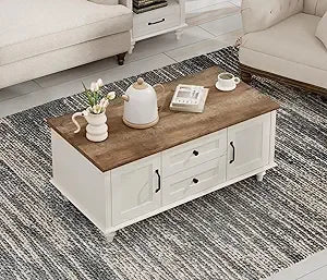 This chic and modern coffee table combines contemporary design with a touch of farmhouse charm. Its rectangular shape features a white body and distinctive gourd legs, with a unique design that ensures both the front and back sides look equally attractive. The table's overall dimensions are 41.7 inches in length, 21.6 inches in width, and 18.1 inches in height. The coffee table offers ample storage with two smooth-gliding drawers, perfect for organizing magazines, remote controls, and other items while keeping them dust-free. Additionally, the storage cabinets on either side provide extra space for your belongings. Made from durable MDF and sturdy metal, this table is built to last, with the tabletop capable of supporting up to 88 lbs and each drawer holding 11 lbs. The solid wood legs ensure the table is strong and can withstand long-term use. The table's finish mimics a distressed surface, giving it a high-quality and textured appearance. It also features a generous space between the bottom and the floor, allowing for easy passage of a robot vacuum cleaner. Assembly is straightforward, thanks to detailed instructions and labeled parts. The table arrives in a secure box with protective measures to ensure it reaches you in perfect condition. If you encounter any issues or are not satisfied with the product, feel free to reach out to us. The wood used in this table is FSC certified, ensuring environmental sustainability.