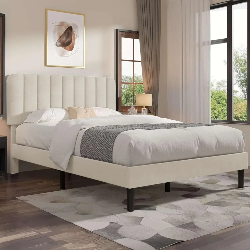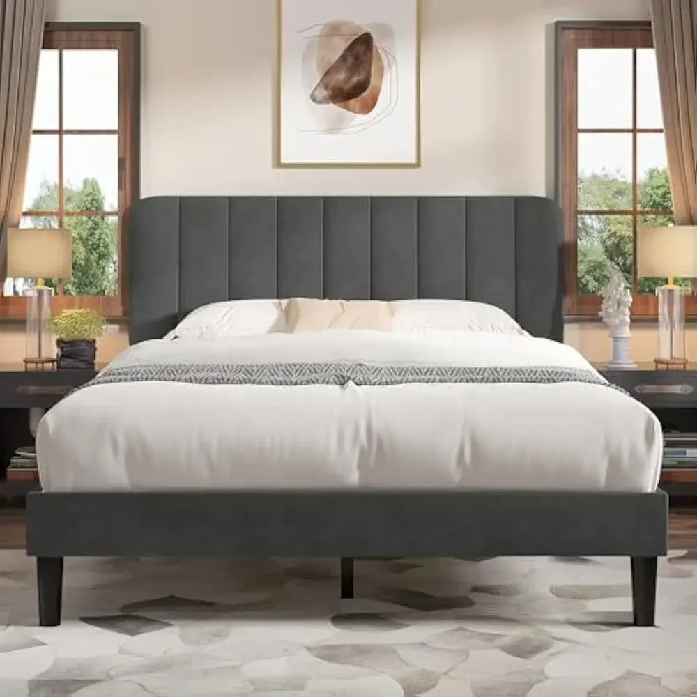 - [Easy Assembly] This queen upholstered bed frame with a wooden headboard is designed for effortless assembly. All the necessary parts and tools are smartly packed into one box. The slats of the bed frame feature Velcro attachments, allowing for quick and efficient assembly. You can have your queen upholstered bed fully assembled within one hour. (PLEASE NOTE: MATTRESS SOLD SEPARATELY)