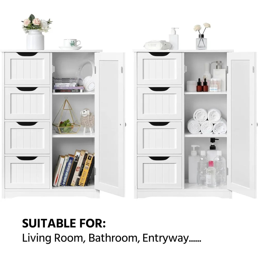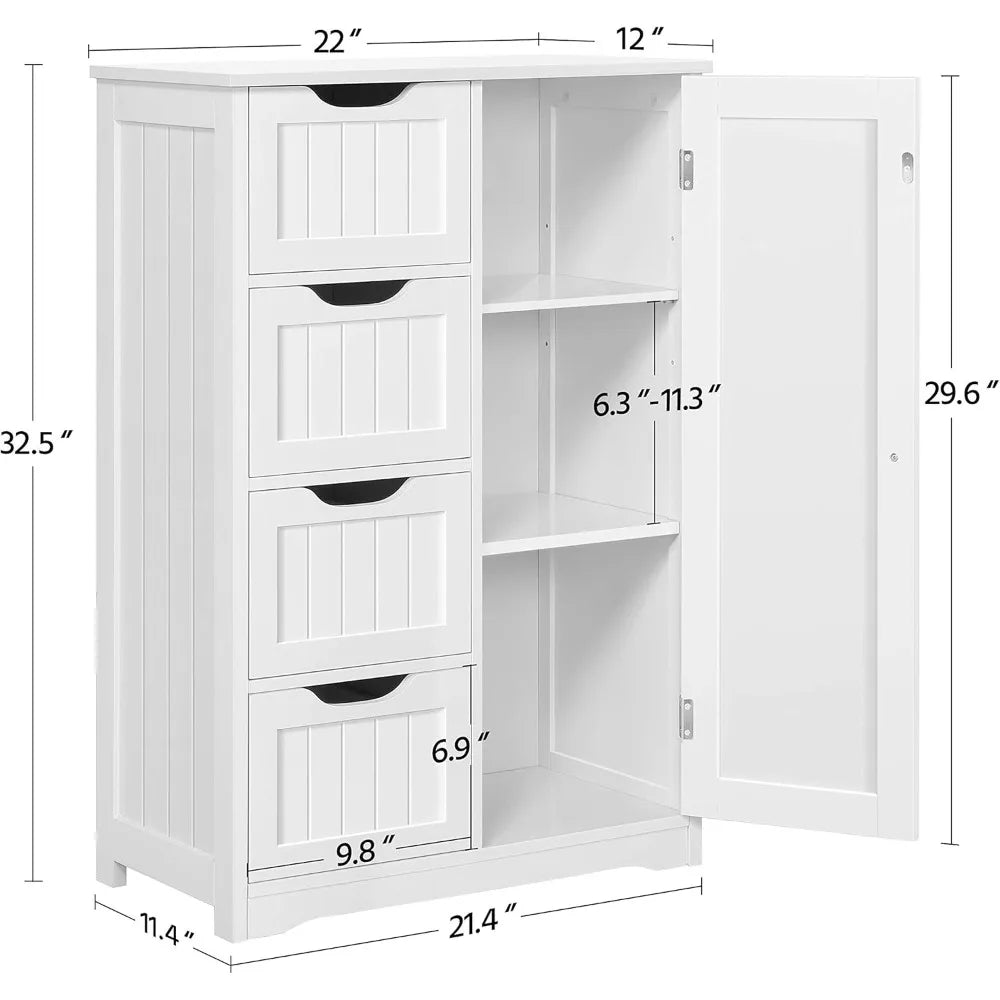 This free-standing cabinet offers a robust structure with a high load capacity of up to 45 kg/99 lb, fulfilling basic storage needs. Its waterproof surface, made of painted MDF, is designed to withstand humidity, making it ideal for use in bathrooms and kitchens. The cabinet features a sleek rectangular design with beadboard panels on the drawer fronts and door, suitable for various home decor styles from traditional to modern. Assembly is straightforward with all required hardware and an illustrated guide provided for a quick and easy setup. It includes four drawers with cutout handles and a single-door cabinet with an adjustable shelf, providing an organized storage solution for toiletries, towels, and cosmetics, keeping your bathroom essentials neatly organized.